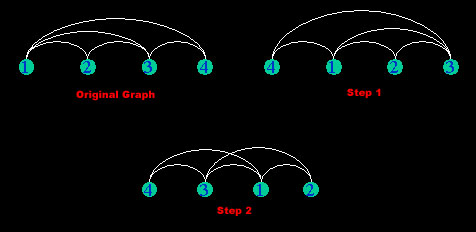 the original graph is 5. |f(1)-f(2)| + |f(3)-f(4)| + |f(1)-f(4)| = 1 + 1 + 3 = 5. After moving vertex 2 all the way to the left of the graph, the sum reduces to 4. |f(1)-f(2)| + |f(3)-f(4)| + |f(1)-f(4)| = 1 + 1 + 2 = 4. Thus we keep going to find a minimum sum. After step 2, the sum is 3. |f(1)-f(2)| + |f(3)-f(4)| + |f(1)-f(4)| = 1 + 1 + 1 = 3. This is the best possible arrangement of the graph because all edges have length 1 and we get 3 as the minimum sum of the graph. Observation 3: Anytime the graph has edges where |f(x) - f(y)| = 1 for all x,y vertex pairs, then the minimum sum is n - 1 where n is the number of vertices. This is also the best possible layout since no edge length can be reduced below one. | |