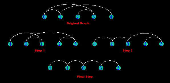 the original graph is 8. |f(1)-f(2)| + |f(2)-f(3)| + |f(3)-f(4)| + |f(1)-f(3)| + |f(1)-f(4)| = 1 + 1 + 1 + 2 + 3 = 8. After moving vertex 4 all the way to the left of the graph, the sum is still 8. |f(1)-f(2)| + |f(2)-f(3)| + |f(3)-f(4)| + |f(1)-f(3)| + |f(1)-f(4)| = 1 + 1 + 3 + 2 + 1 = 8. Thus we keep going to find a minimum sum. After step 2, the sum is 7. |f(1)-f(2)| + |f(2)-f(3)| + |f(3)-f(4)| + |f(1)-f(3)| + |f(1)-f(4)| = 1 + 2 + 1 + 1 + 2 = 7. This is the best possible arrangement of the graph and we get 7 as the minimum sum of the graph. Observation 2: For a set of vertices nx...ny, if nx and ny are connected by an edge and every vertex between is connected by an edge of length one to the vertices adjacent to it, then there is no furthur optimization possible on this set of vertices. *In the example above, this applies to the vertex sets [4,3,1] and [3,1,2] of the final graph. | |